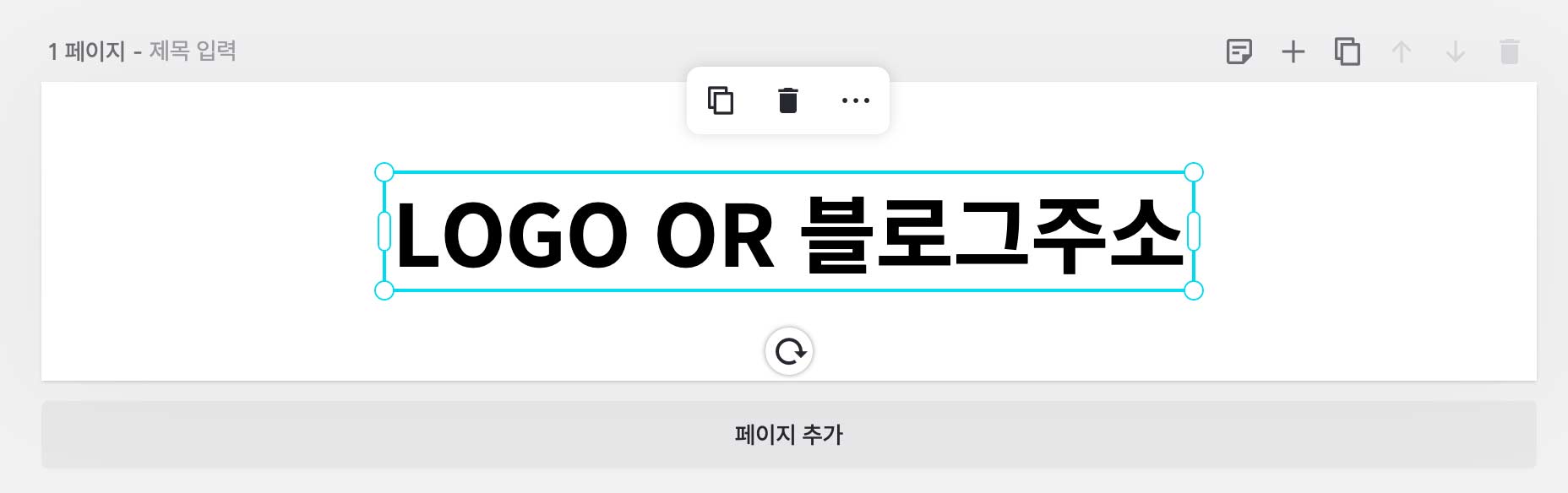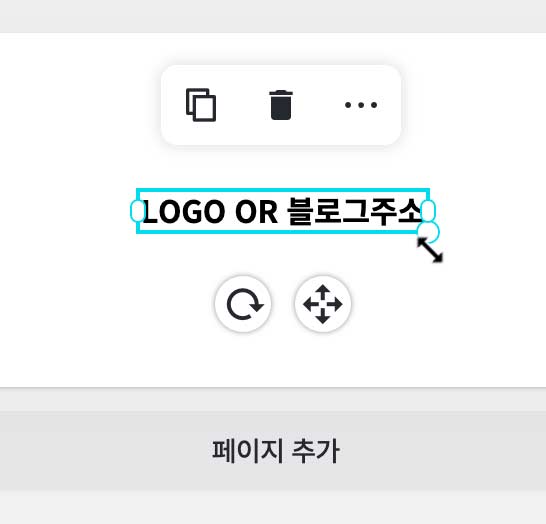 이곳에 로고나 블로그 주소를 입력해주면 간편하게 로고로 활용할 수 있습니다. 파란색의 박스 바깥 테두리 중 모서리의 작은 원형에 마우스를 올리면 대각선의 화살표 아이콘으로 마우스 포인트가 바뀌게 되는데 이때 드래그를 하면 크기를 조절할 수 있습니다.