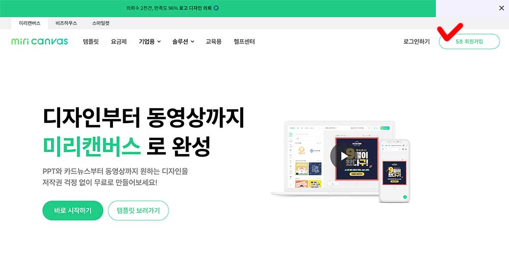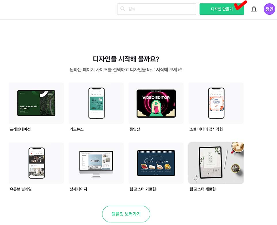 로그인을 한 후에 다시 우측 상단에서 디자인 만들기 버튼을 클릭해줍니다.