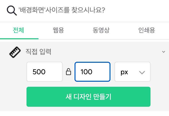 이제 여기서 원하는 사이즈를 입력해주면 되는데 저는 5:1 비율로 로고를 만들기 위해서 500 * 100 픽셀을 입력해줬습니다. 수치를 입력해줬다면 새 디자인 만들기 버튼을 클릭해줍니다.