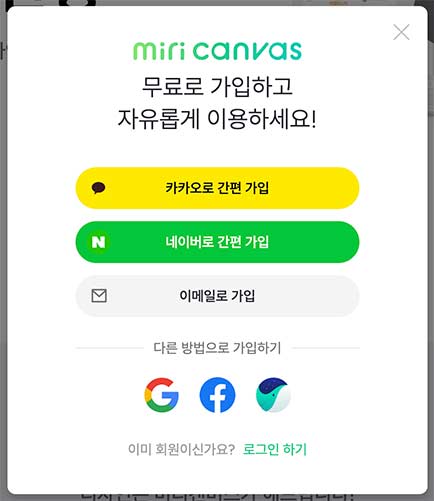 회원가입 버튼을 클릭하면 나오는 팝업창에서 원하는 SNS를 이용해 회원가입을 해줍니다. 저는 네이버로 간편 가입을 했으며 브라우저가 미리 네이버에 로그인 되어있다면 로그인하는 과정조차 필요 없으니 버튼 한번만으로 가입이 완료됩니다.