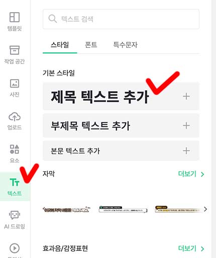 이제 가장 좌측 메뉴 중 텍스트 메뉴를 클릭한 후에 원하는 텍스트 형식을 선택해줍니다. 저는 로고를 만들기 위해 제목 텍스트 추가 버튼을 클릭해줬습니다.