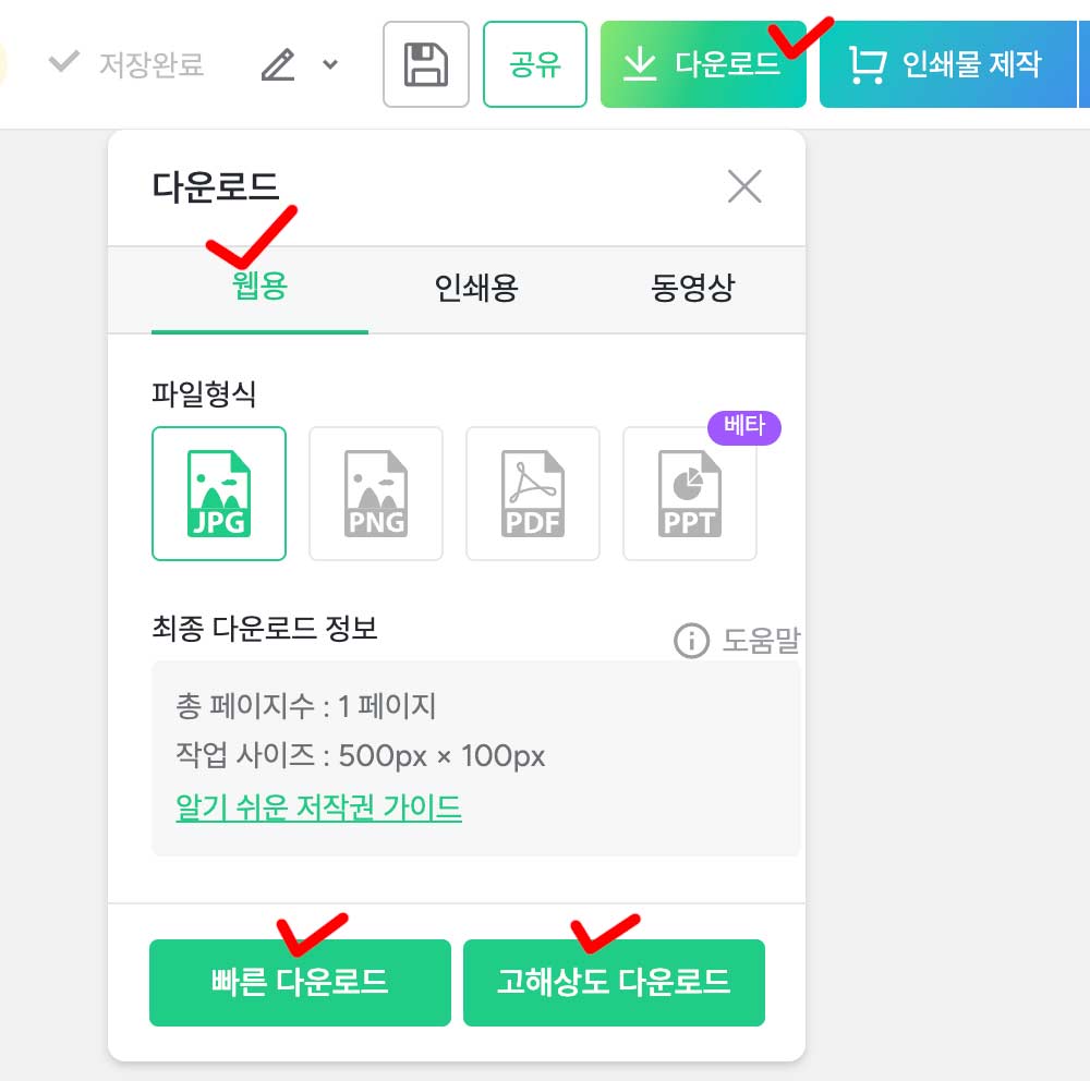 이제 우측 상단의 다운로드 버튼을 클릭 후 웹용을 누르고 원하는 파일 형식을 체크해준 다음 하단의 다운로드 버튼을 누르면 완성입니다.